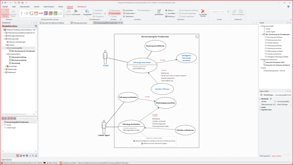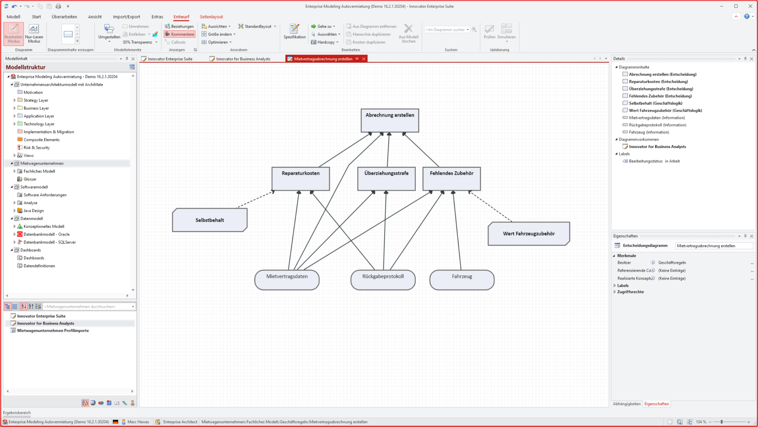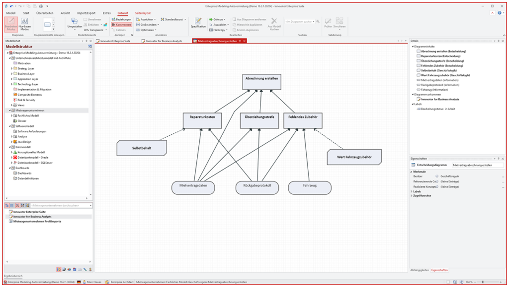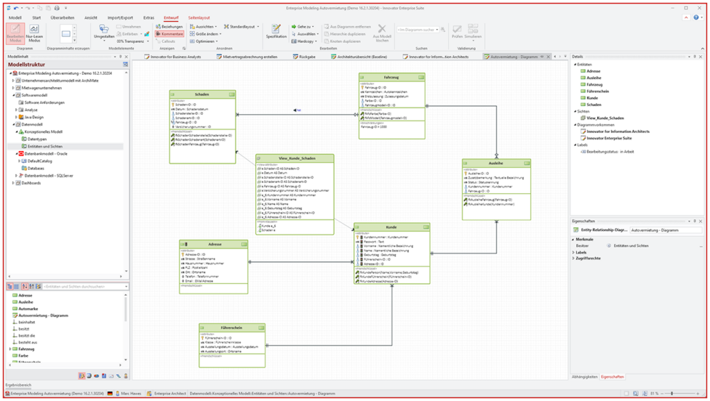 Innovator vereint alle Modellierungsdisziplinen in einem Tool: Business Analysten modellieren Prozesse, Entscheidungen und Anforderungen standardisiert mit BPMN und DMN. Enterprise Architekten entwerfen mit ArchiMate® eine strukturierte Unternehmensarchitektur. Data Architekten erstellen konzeptionelle, logische und physische Datenmodelle (ERM, UML, u.v.m.) sowie Data Warehouses und nutzen multidimensionale Modellierung – samt sicherem Abgleich zur Datenbank. Komfortable Diagrammeditoren, leistungsstarke Automatisierungen und eine intuitive Oberfläche im modernen MS Office Look & Feel machen die Modellierung einfach und effizient.