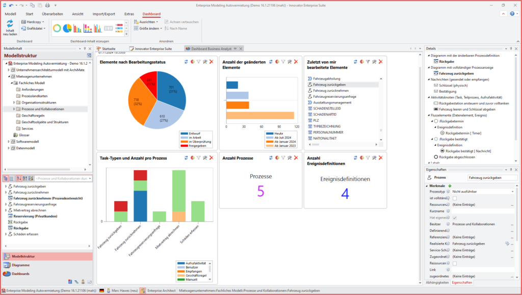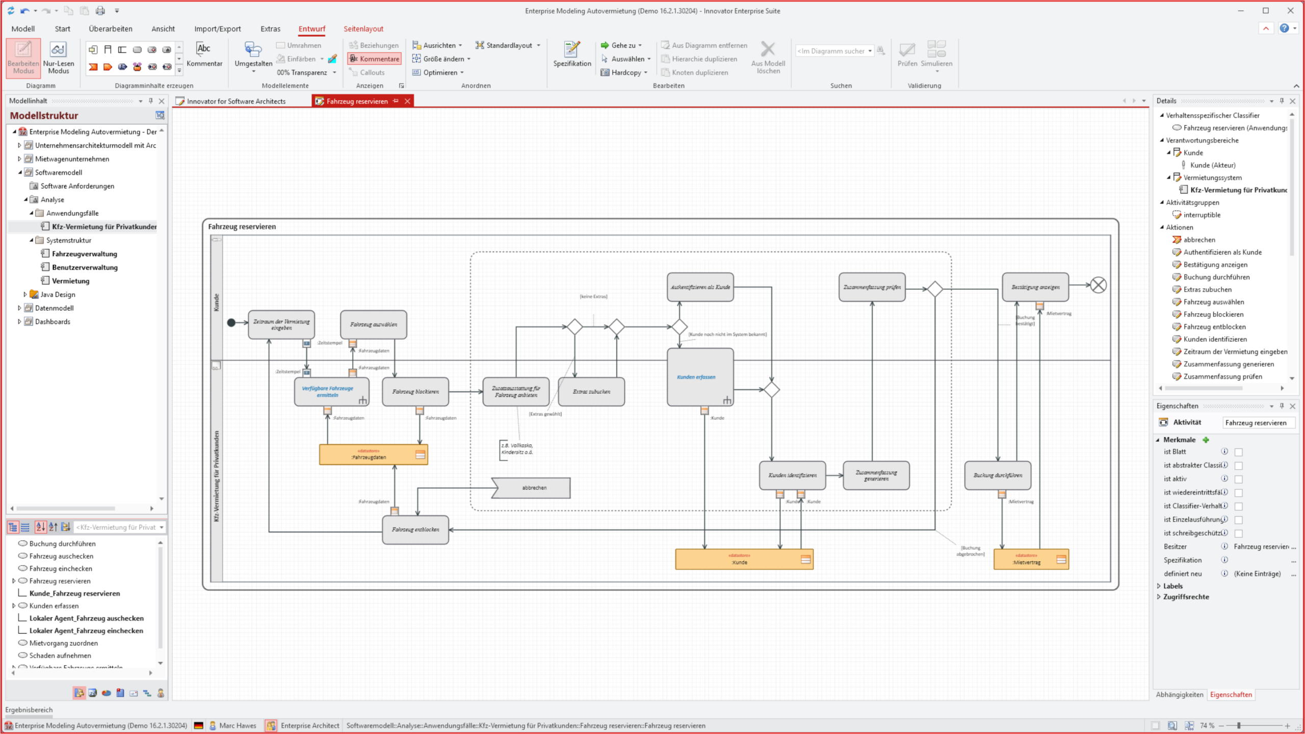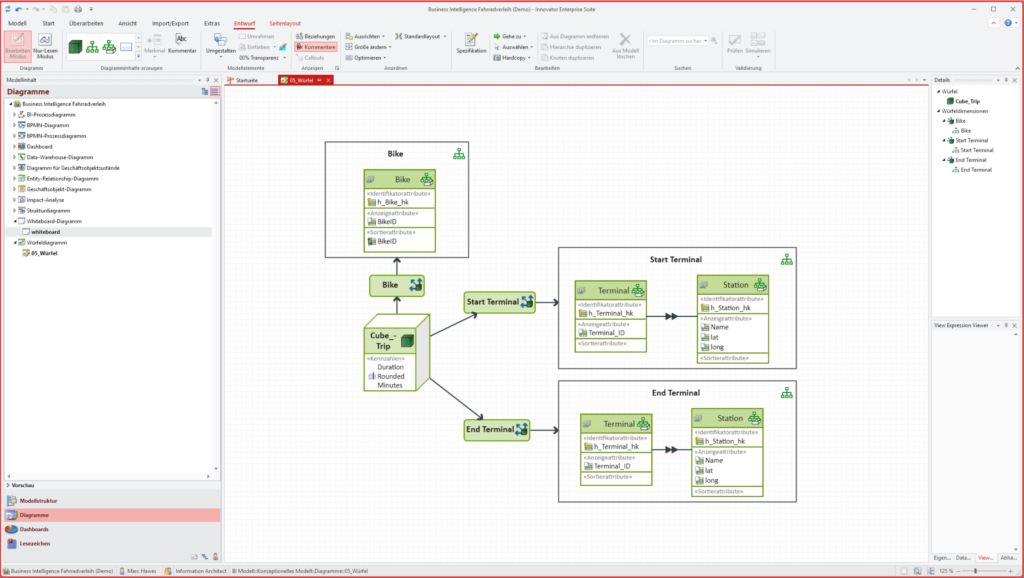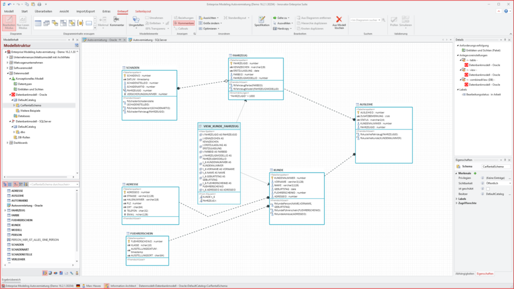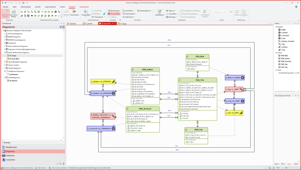 Innovator vereint alle Modellierungsdisziplinen in einem Tool: Business Analysten modellieren Prozesse, Entscheidungen und Anforderungen standardisiert mit BPMN und DMN. Enterprise Architekten entwerfen mit ArchiMate® eine strukturierte Unternehmensarchitektur. Data Architekten erstellen konzeptionelle, logische und physische Datenmodelle (ERM, UML, u.v.m.) sowie Data Warehouses und nutzen multidimensionale Modellierung – samt sicherem Abgleich zur Datenbank. Komfortable Diagrammeditoren, leistungsstarke Automatisierungen und eine intuitive Oberfläche im modernen MS Office Look & Feel machen die Modellierung einfach und effizient.