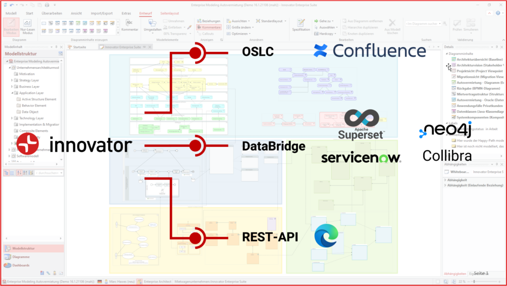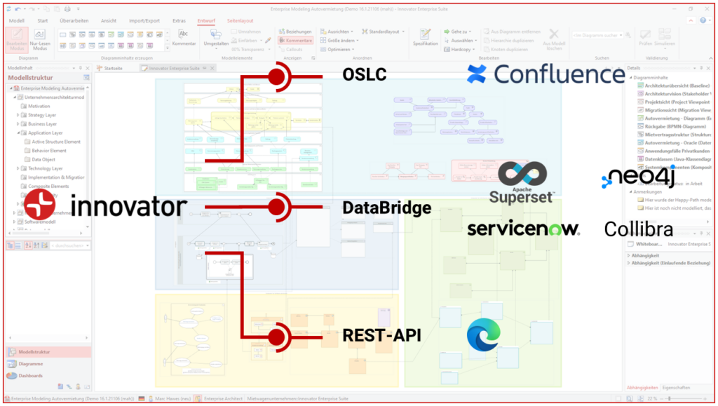 Mit Innovator bist Du immer technologisch vorne dabei. Neben klassischen Datenbanken wie Oracle, SQL Server und PostgreSQL unterstützt Innovator auch moderne Plattformen wie MongoDB, Databricks®, Athena, BigQuery und Snowflake®. Über die DataBridge integrierst Du Deine Modelle bidirektional in andere Tools. Zusätzlich stehen Dir zahlreiche Schnittstellen, etwa zu Confluence, Neo4j®, Collibra und Apache Superset, zur Verfügung. Dank moderner REST-API kannst Du alle Modellfunktionen webbasiert nutzen und Innovator flexibel in Deine IT-Landschaft einbinden. So kannst Du hybride Architekturen modellieren, Cloud-Lösungen einbinden und neue Technologien flexibel integrieren.