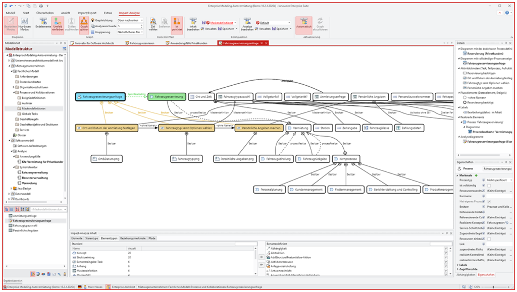 Innovator erstellt automatisierte, individuell konfigurierbare Dokumentationen und Dashboards. Im Unterschied zu PowerDesigner profitierst Du von interaktiven Impact-Analysen: Erkenne in Echtzeit, wie sich Änderungen auf Prozesse, Daten, Systeme und ganze Architekturen auswirken. Navigiere direkt in den Abhängigkeitsdiagrammen und exportiere Berichte passgenau für Audits und Teams. Die lückenlose Nachverfolgung jeder Änderung und die flexible Auswertung über verschiedene Sichten geben Dir eine Transparenz und Effizienz, wie sie klassische Tools nicht bieten.